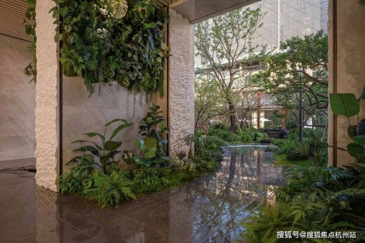 藤蔓沿墙垂落,水流自然流入,花草在架空层间摇曳生姿,使这一开放场域成为生机盎然的灵动空间。