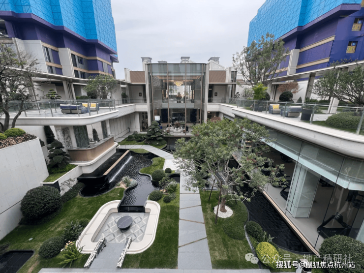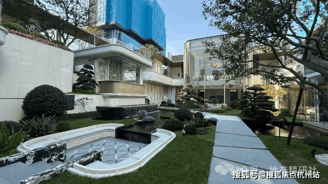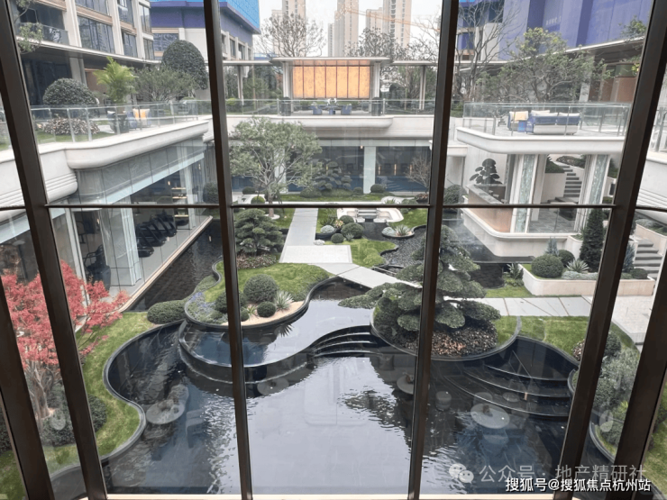 滨江经典的热带园林景观,种满了高大的热带树种;除了下沉式庭院中的水景外,园区中央还有一座异形景观水池。