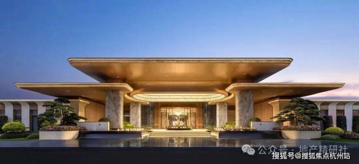 宽约78.8米、高约9.2米的大门,奥映鸣翠同款的梵高白石材,温润大气,与古铜色铝板的搭配,透出古典的韵味又不失轻盈。传统建筑穹顶元素也进行了现代化演绎,到了晚上灯光亮起,就变成了金碧辉煌的藻井。