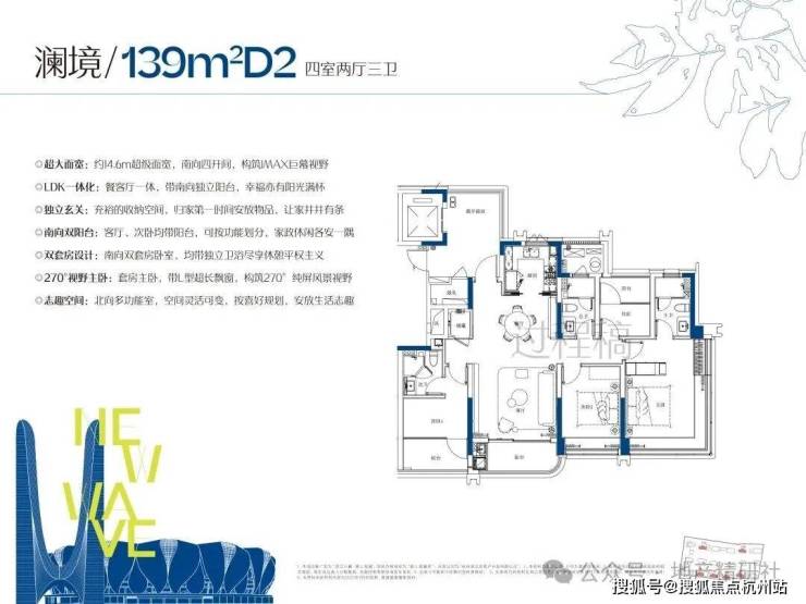 该户型采用一梯一户设计,电梯厅可作为住户的过渡空间,提升了出入的私密性与便利性。室内布局为四房三卫,包含两个带独立卫生间的套房。南向立面面宽约14.6米,使主要功能区域能获得较好的采光。主卧室采用了转角飘窗设计,以增加室内光线与视野。