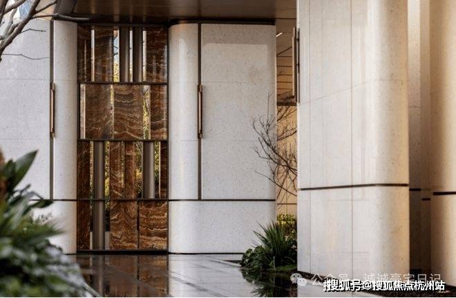 门庭延街的外立面,以精工定制弧形米色石材为主调,镶嵌典藏级老虎玉大理石,点缀古铜色现代海派艺术感灯器,整体呈现出百年海派的贵雅气质。