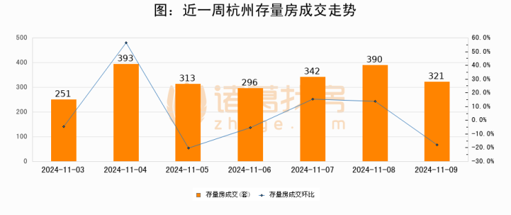 从存量房来看,2024年11月09日杭州存量房单日成交321套,比昨日减少69套,环比下降17.7%。从近一周存量房成交来看,杭州存量房日均成交套数为329套,11月09日单日成交321套,低于近一周平均水平2.4%。