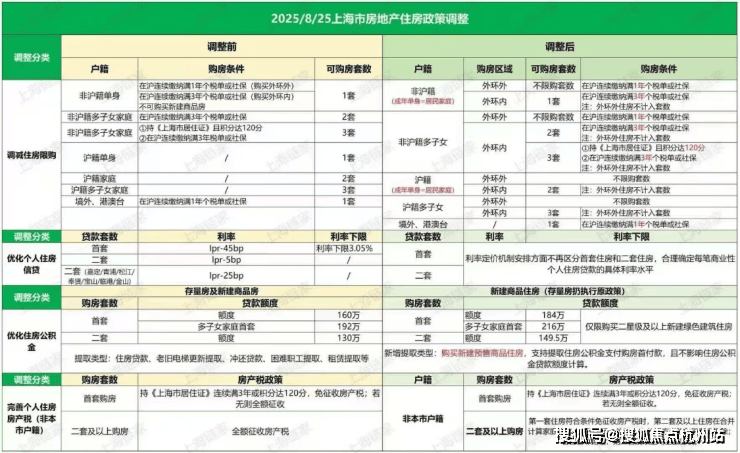 ▫️沪籍家庭/单身:外环外不限套数▫️非沪籍满1年社保:外环外不限套数▫️外环内限购2套(沪籍)/1套(非沪籍满3年)❷公积金贷款额度大幅提升!▫️首套最高160万→184万▫️多子女家庭首套192万→216万▫️二套最高130万→149.5万(购买绿色建筑住房可享上浮)❸商贷利率不再区分首套二套!银行自主定价购房利息负担进一步减轻❹房产税优惠升级!▫️非沪籍首套暂免征收▫️二套及以上享人均60㎡免税面积