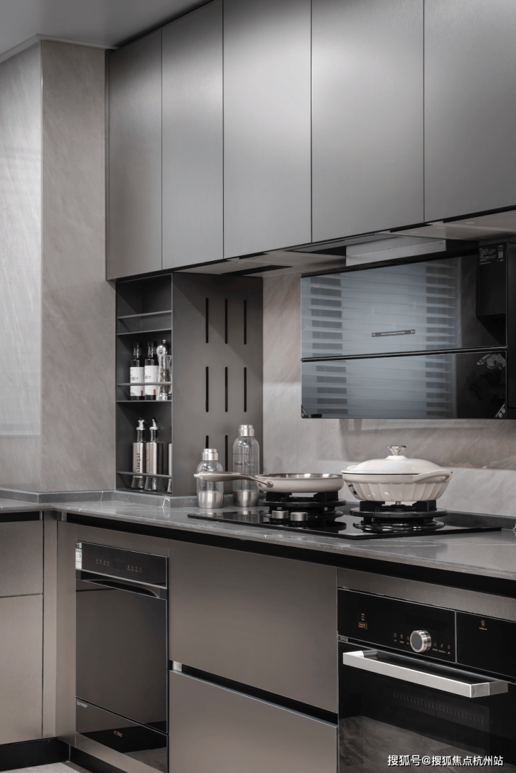 厨房采用 U 字型设计,石英石台面,比人造石台面更耐热、耐压。同时标配厨房七件套包括(油烟机/灶台/洗碗机/蒸烤一体机/冰箱等),还有末端净水器和凉霸。