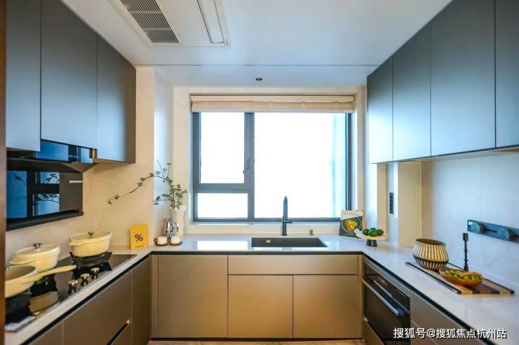 厨房顶面采用更便于清洁的金属体系,厨电是博世四件套(油烟机、三眼灶、洗碗机、蒸烤一体机),效率与审美同时在线;