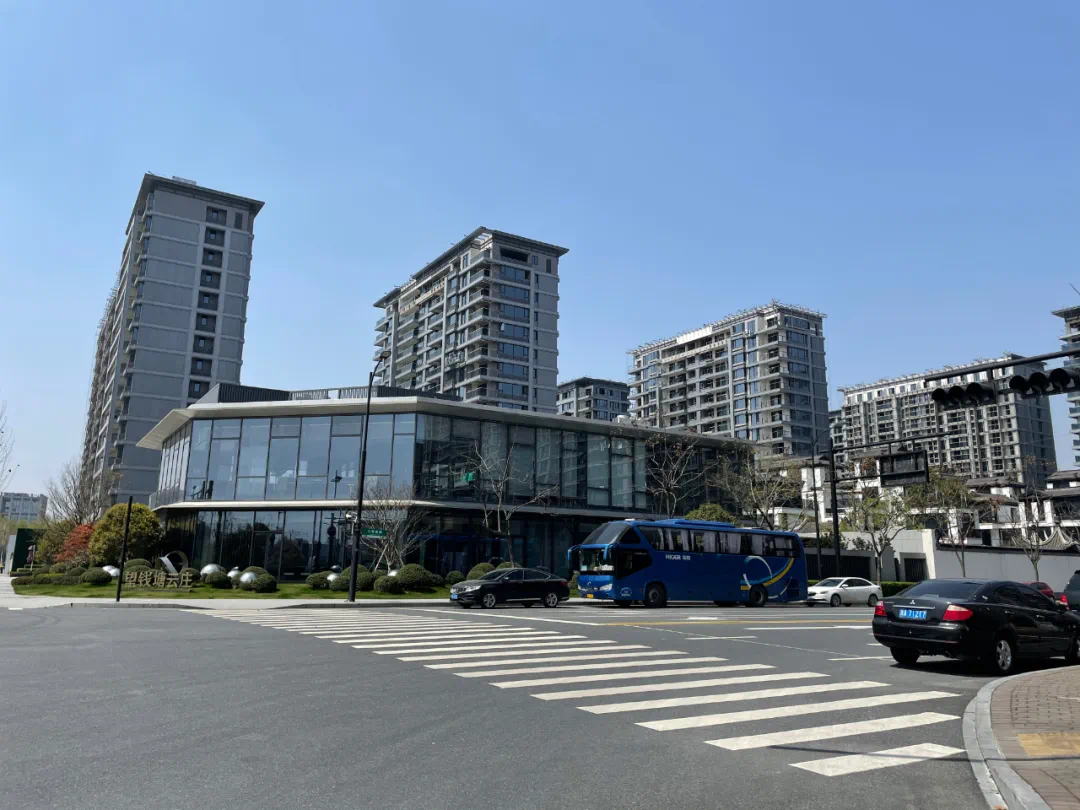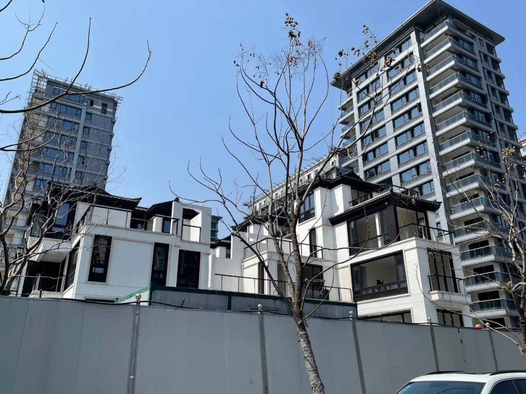 望钱塘云庄更靠近钱塘江边,周边挨着安置房项目杨公社区。从现场来看,售楼处没有开放,而工人们都在正常施工,除了西侧还有几幢楼的外立面没有建好,小区内的高层、中式合院等,都已经呈现出完整的外立面。