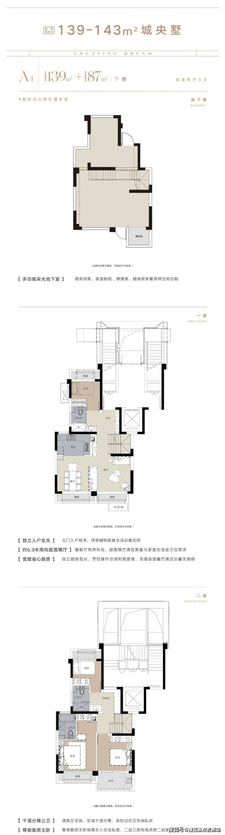 叠墅产品:134/143㎡四室两厅三卫,下叠含庭院空间,上叠带露台,定位高端改善需求