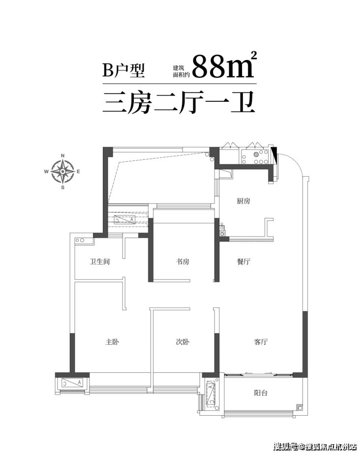 建筑面积约88㎡精雅三房一卫 ,三口之家理想