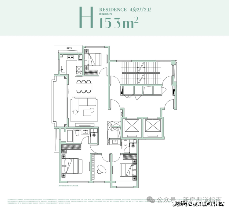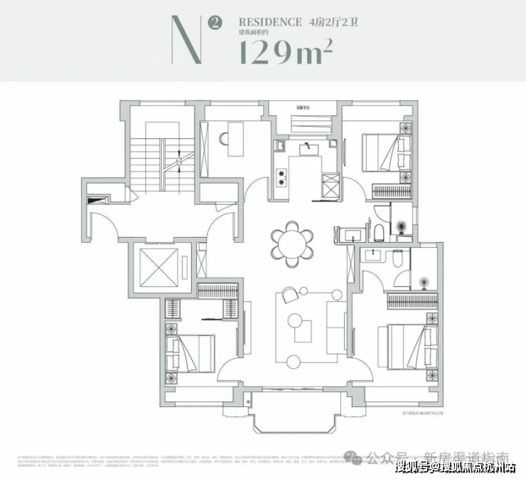 该户型是经典的四叶草布局,四开间分布在四角,兼顾私密与互动,是二胎家庭的优选;