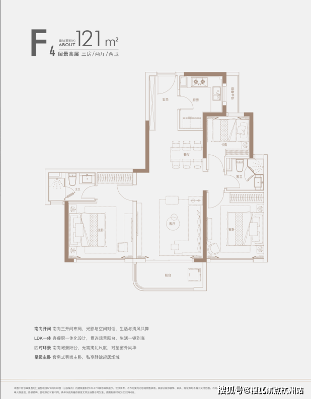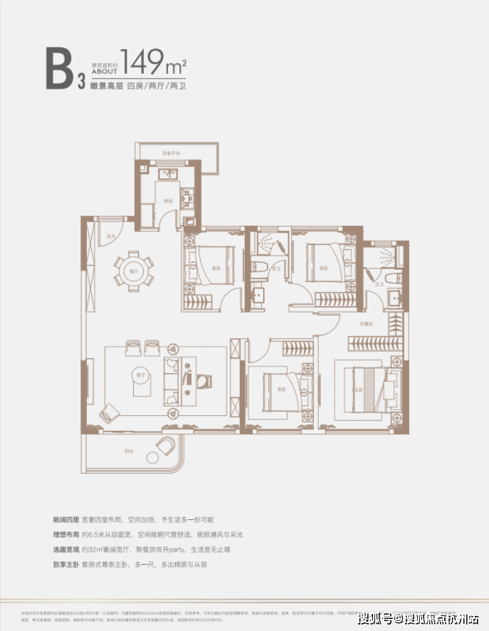 建面约140㎡四房:三开间朝南户型,南北通透,采光条件优质,客厅明亮宽敞,彰显大气布局。