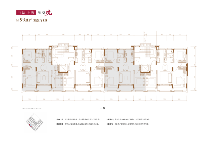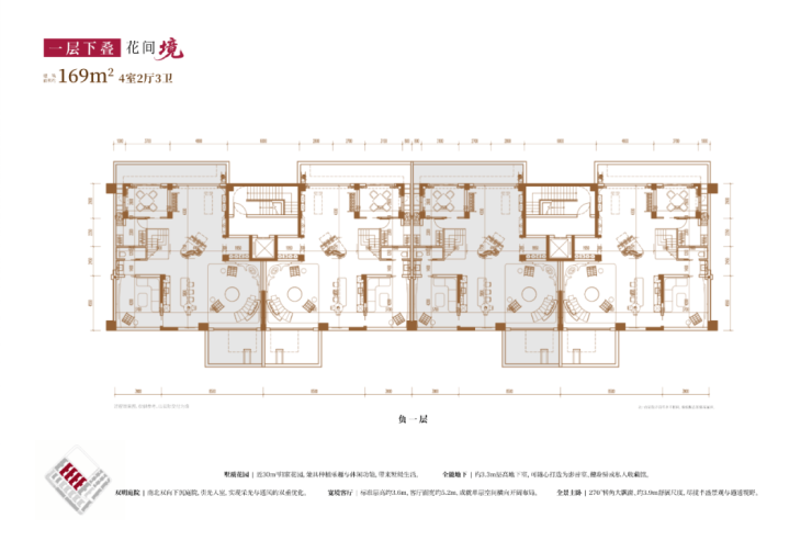 从内部空间体系来看,地上三层,层高分别是3.6米、3.3米和3.3米;每个单元一梯两户,每户均拥有类独立电梯厅;一楼带地下室及庭院,并通过创新退台式设计为二楼和三楼打造私家空中花园,形成户户有花园的墅居生活方式。