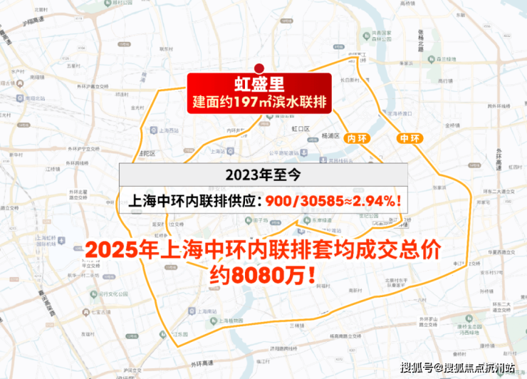 建面约197㎡滨水联排堪称中环稀缺藏品——2023年至今,中环内联排供应占比 不足3% ,套均成交总价高达约 8080万 (包含风貌)。 虹盛里的联排不仅填补了区域市场空白,总价更具亲和力。