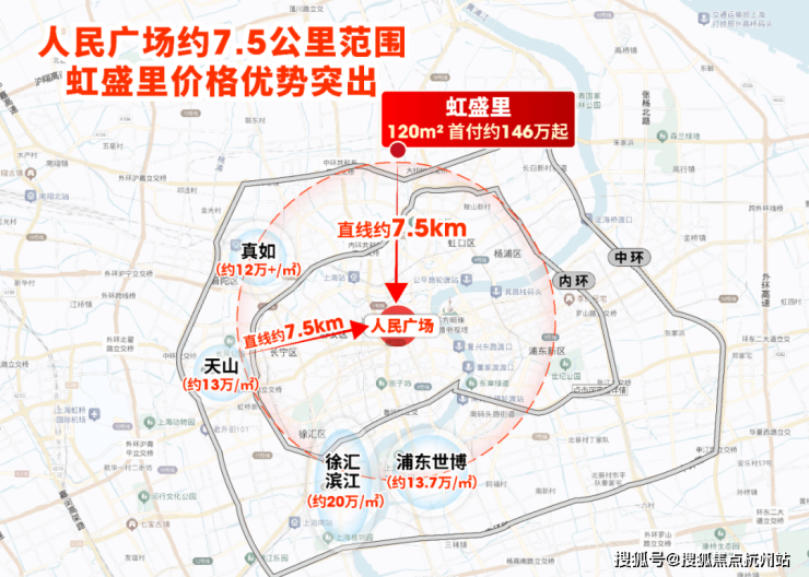 项目直线距离人民广场仅约7.5公里,在真如、徐汇滨江、天山、世博等同等区位板块中,是价格更划算的新房选择。