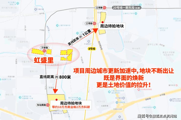 三轨交环绕形成高效通勤网—— 直线距离3号线江湾镇站约500米 ,3站虹口足球场/7站人民广场/8站南京西路/9站静安寺; 直线距离20号线万安路站约150米(在建)/直线距离南北大动脉19号线车站南路站约900米(在建) ,未来可直达北外滩、陆家嘴。