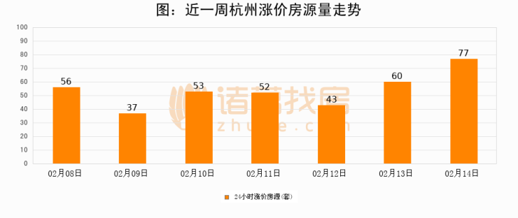 根据诸葛找房数据显示,杭州24小时涨价房源量为77套,较02月13日增加17套,环比上涨28.3%。与此同时,涨价房源占比小幅扩大,业主信心有所提升。