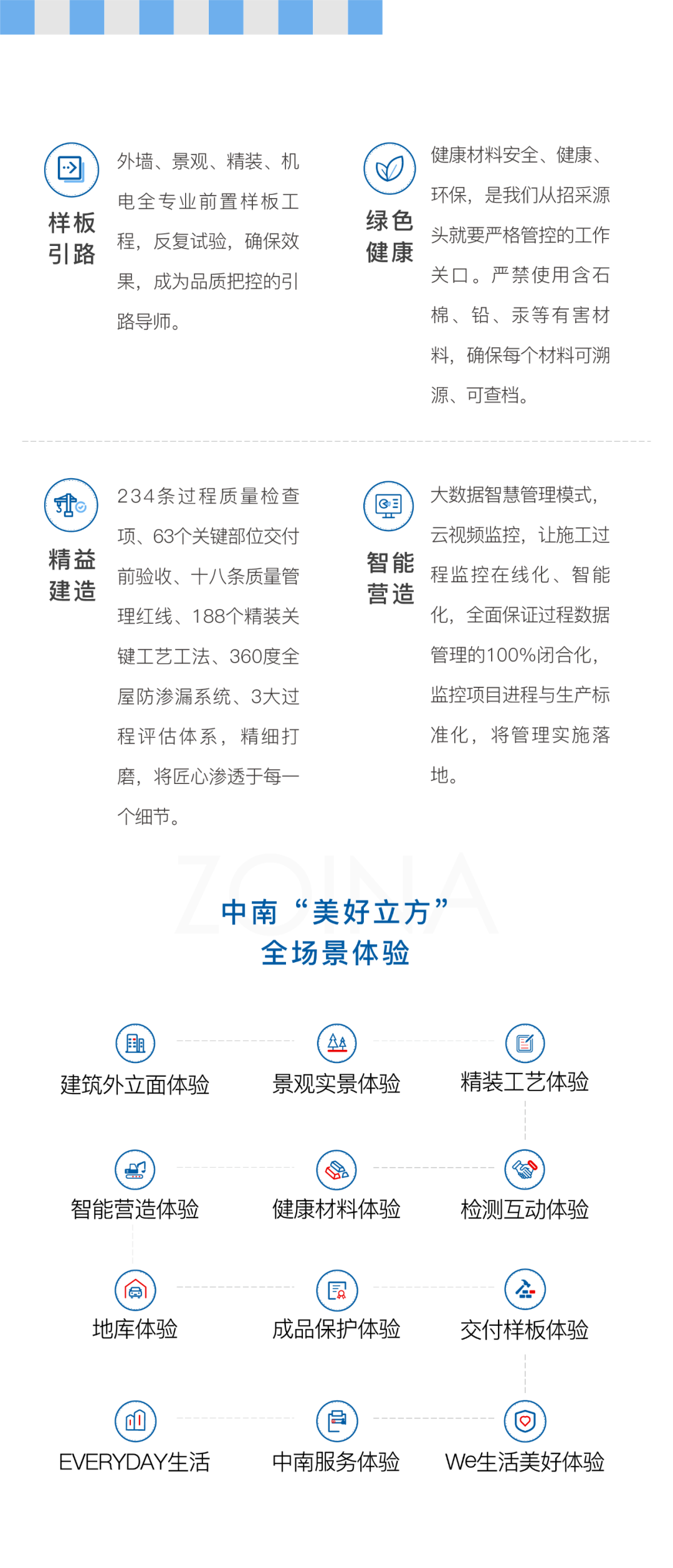面对施工周期长,信息不对称的地产开发现状,工程可视化,无疑是消除客户疑虑、强化信任感的重要途径。中南「美好立方」工地开放体验,以“家”为原点,聚焦客户的敏感点,对容易产生质量隐患的施工环节可视化,还原关键工法工序,全方位的展现中南“样板引路、绿色健康、智能营造及精益建造”4大品质营造理念,让家的建造的所有细节可触可感业主“所见即所得”,放心安心。