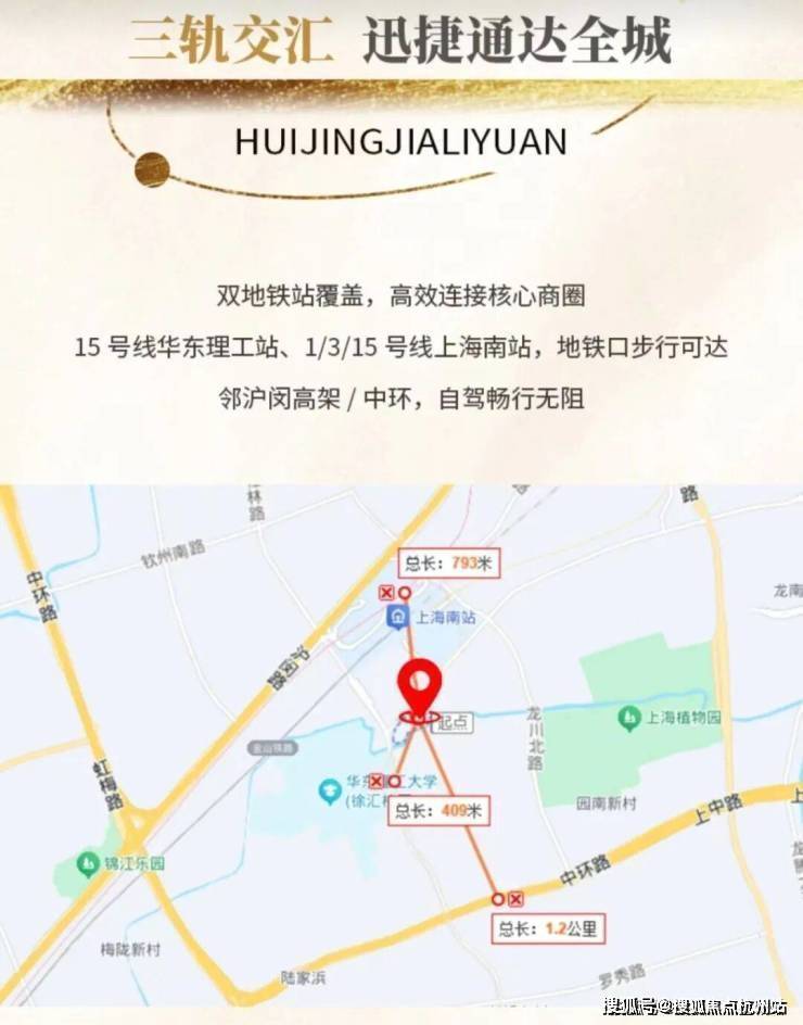 * **三轨交汇的核心优势**:小区最大的核心竞争力在于轨道交通。步行约300米可达地铁15号线华东理工大学站,步行约900米可达上海南站(1、3、15号线三线换乘)。这对依赖地铁通勤的上班族是巨大的吸引力。