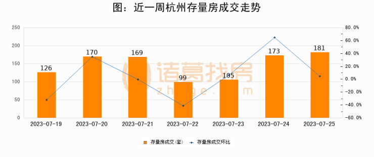从存量房来看,2023年07月25日杭州存量房单日成交181套,比昨日增加8套,环比上涨4.6%。从近一周存量房成交来看,杭州存量房日均成交套数为146套,07月25日单日成交181套,高于近一周平均水平24%。