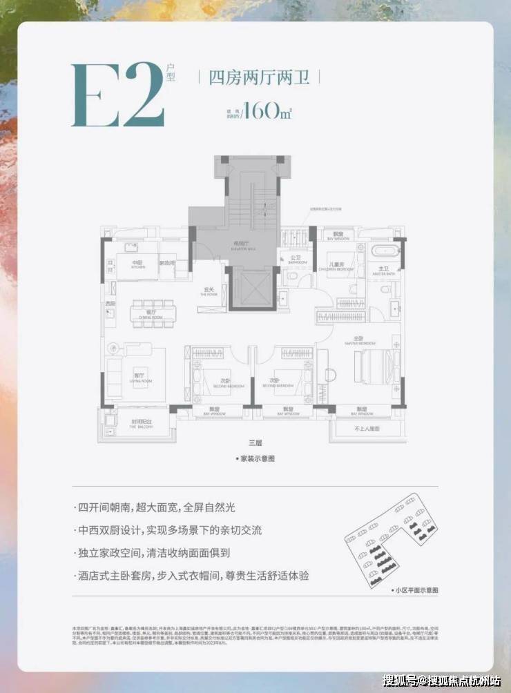 三开间朝南。拥有充分的采光。主卧及北卧室还带有L型飘窗,大进深阳台全景落地窗,优化采光,提升观景体验。