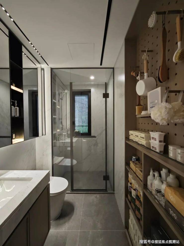 另外,在卫生间部分,项目在台盆对面做了一个墙体的向后延伸,再次做出一个超大尺寸的洞洞墙板和储物柜,原本只有镜柜的收纳空间瞬间就扩大了不止一倍。