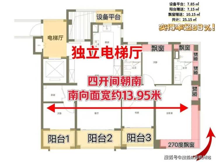 类一梯一户的独立电梯厅+约13.95米南向大面宽+三阳台和设备平台的超高实得率+270度全景舱视野+超高效收纳,实得率超93%!