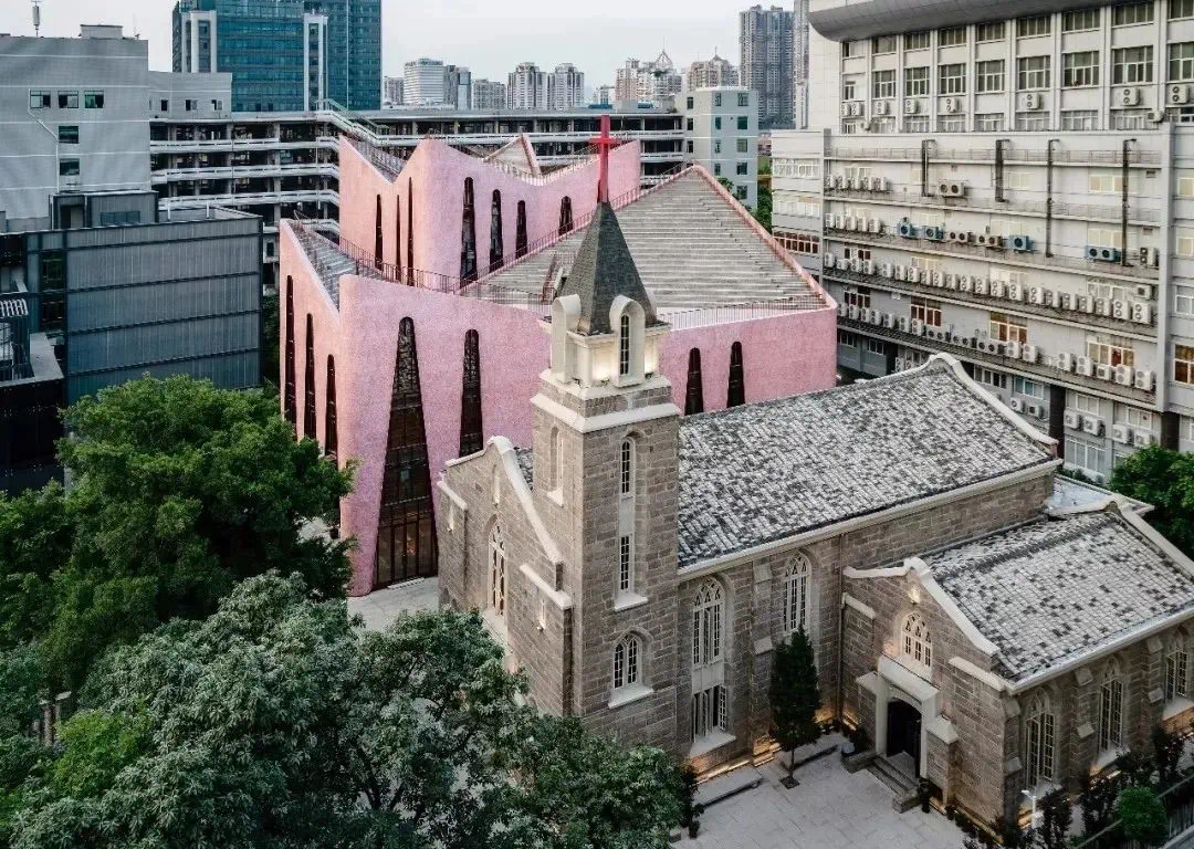 三坊七巷里的花巷教堂,从1938年建成以来,历经了几轮中国特殊历史下的巨变,重新恢复使用后因额外空间的需求,建造了比花巷教堂大7倍的新花巷教堂,惊艳的粉调立面和超设计感的新堂,为福州增添了一个当地人和游客频频打卡的热门去处。