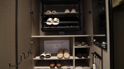 进门后,看到的就是第一个智慧收纳空间——入户玄关柜,储物空间不仅宽敞大气,柜内还配置了旋转鞋架、消毒精灵以及柜门后单杆鞋架。