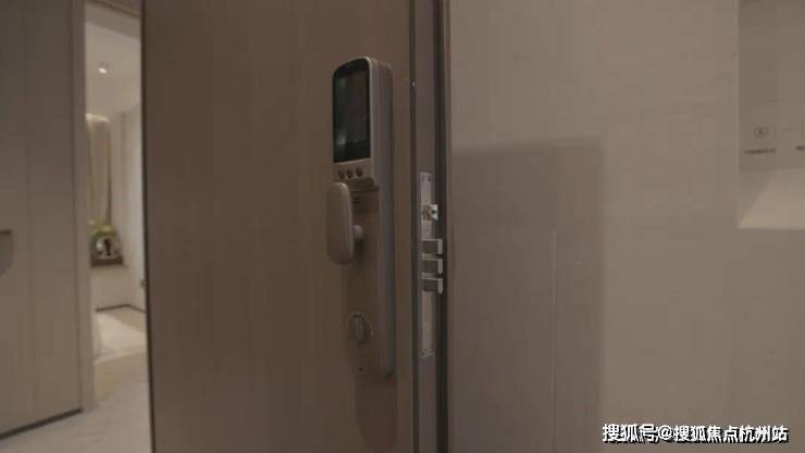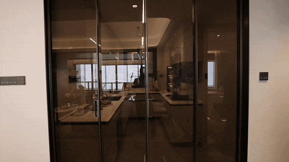 换好鞋,起身可以看到入户门旁配置了窄边框可视对讲,灰色高标肤感开关面板,三合一温控面板,未来可以通过它远程调节灯光,新风,中央空调,地暖,实现智能生活,到家就能享受舒适的居住状态。