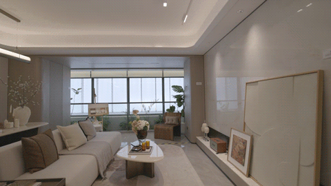 ● 客餐厅:客餐厅地面同样采用了750*1500的大砖,电视背景墙采用浅色大面岩板。顶部采用弧形石膏板吊顶+四边反光灯槽(圆弧角)+吸顶灯+磁吸轨道灯,使客厅空间在视觉上显得更加宽敞。