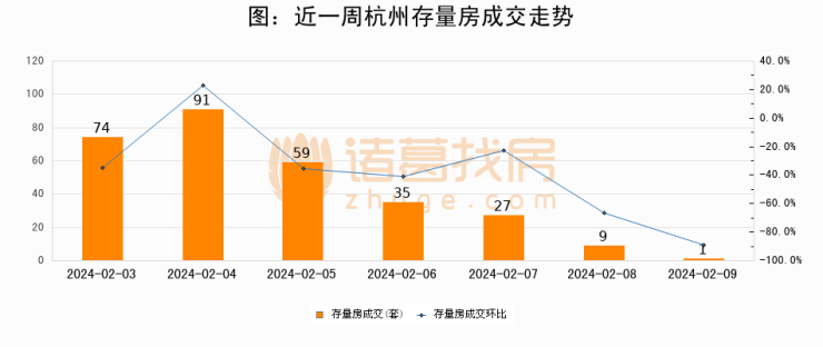 从存量房来看,2024年02月09日杭州存量房单日成交1套,比昨日减少8套,环比下降88.9%。从近一周存量房成交来看,杭州存量房日均成交套数为42套,02月09日单日成交1套,低于近一周平均水平97.6%。