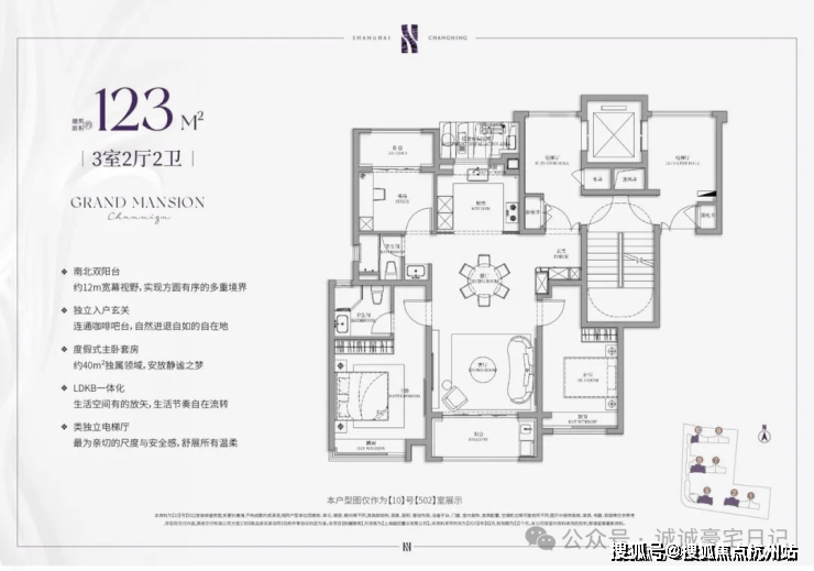项目建面约120㎡户型是类独立电梯厅的设计,室内则是标准的南北通透+三开间朝南设计;主卧套房配置,自带卫生间,私密性和舒适度俱佳。