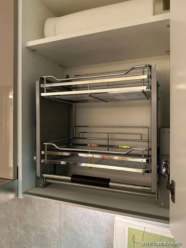 橱柜作为强功能性的收纳系统,自然少不了操作性能上的考究,吊柜做了升降式的拉篮,以后再也不用爬上高凳拿取了。