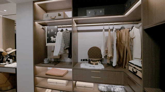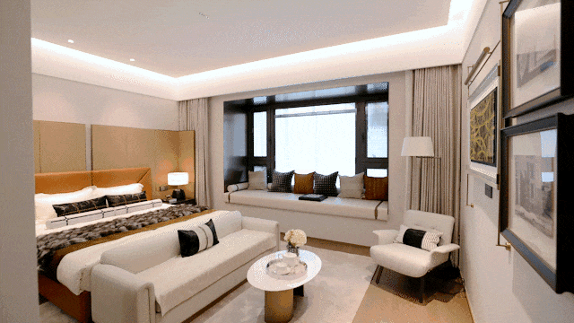 约55㎡豪华全套房主卧 ,除了放一张超大双人床,还能安排上男女双衣帽间、带双台盆的独卫,在功能方面直接多了一个level,关上房门就是主人的“小世界”。