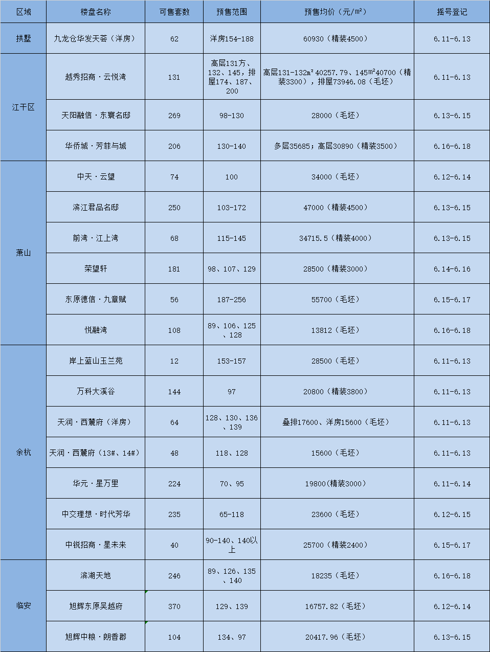 上周共有21盘入市,其中9盘供应量两位数,占供应楼盘的43%,总房源供应量达2892套,较大供应量在余杭区,共计767套房源,其中高房源均价达60930元/平方米,较低均价13812元/平方米。