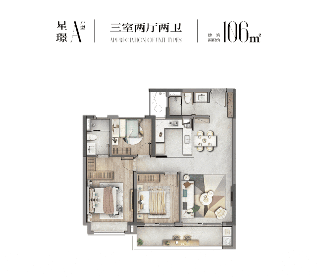 在售户型面积:106㎡3房2卫、130㎡4房2卫、133㎡4房2卫
