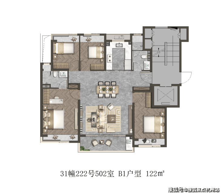 这套户型依旧拥有超高的实得率,6飘窗+1阳台的设计,且无纯走道空间,使得整个户型的可使用面积大大增加。