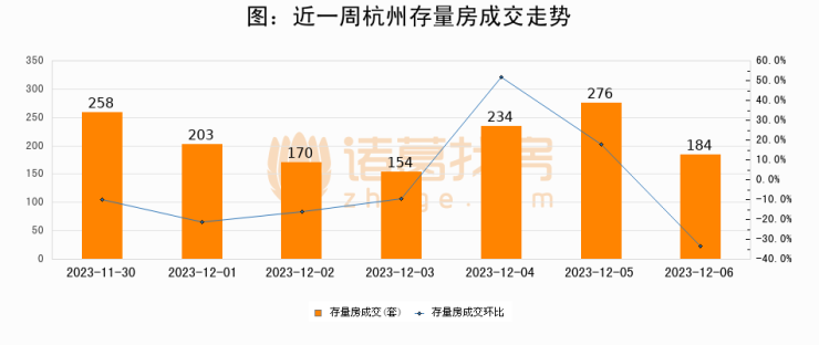 从存量房来看,2023年12月06日杭州存量房单日成交184套,比昨日减少92套,环比下降33.3%。从近一周存量房成交来看,杭州存量房日均成交套数为211套,12月06日单日成交184套,低于近一周平均水平12.8%。