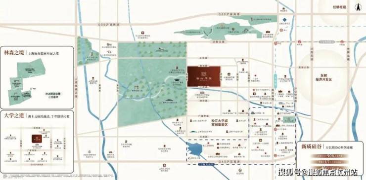 这里有先天优越的生态环境,西侧一路之隔就是广富林文化遗址、广富林郊野公园,北望佘山国家森林公园,周边还有辰山植物园、月湖雕塑公园。
