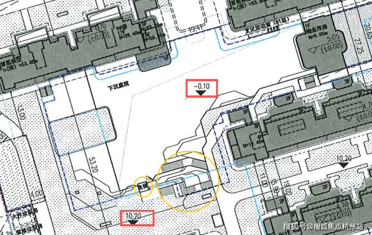 另外,社区规划有下沉庭院及地下会所, 标注-0.1米的下沉庭院与社区平面形成了10.3米的内外高差,南侧设置了电梯与步行楼梯。