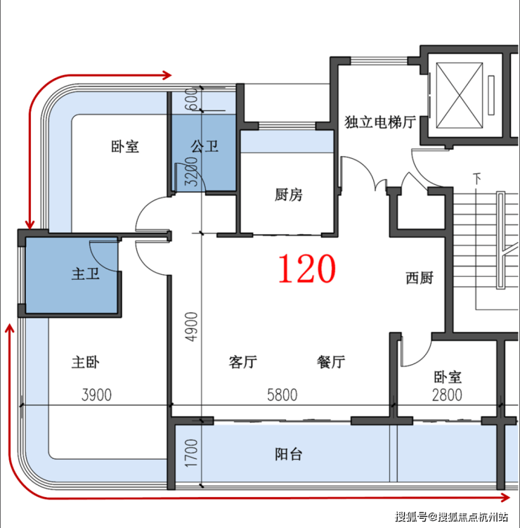 建面约105平米3房,双阳台设计,有一个卧室做了270°转角飘窗 ,有独立电梯厅。