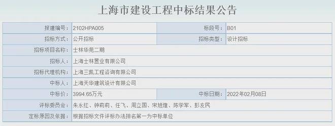 2022年2月8日,上海天华建筑设计有限公司以3994.65万元中标士林华苑二期地块设计项目!