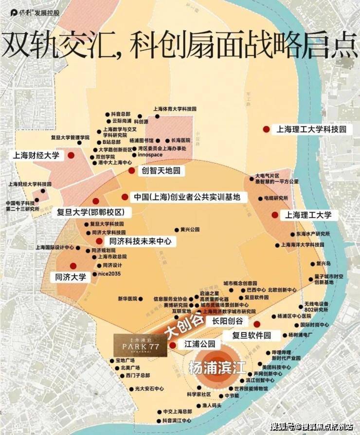 最新发布的科创扇面,以5公里的创新半径,在杨浦滨江南段徐徐展开以江浦公园为支点,将“扇面”展开,上海最密集的高校智力资源汇聚于此北望4公里,百年复旦;向西3公里,同济巍然;东南5公里,上海理工;聚合高端人才、链动产城资源,创新杨浦