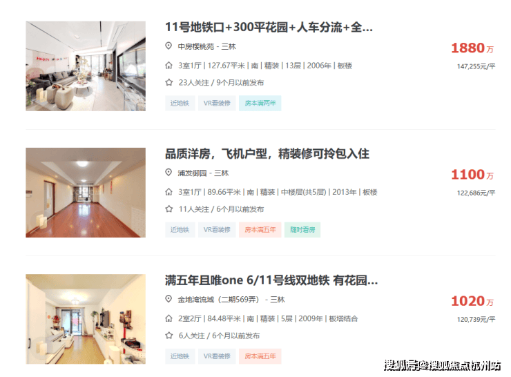 板块内部,由于三林板块规划起步晚,「永泰三里城」周边几乎都是次新电梯房,板块内二手房挂牌均价9万/㎡左右,不少户型较好的楼盘甚至能跑上10w+。