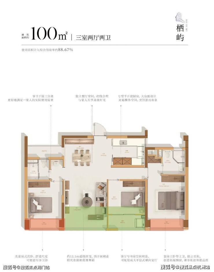 建面约89-104m²的三房、建面约115-132m²的四房,最高实际得房率达到100%,是目前杭州得房率最高的新盘之一!