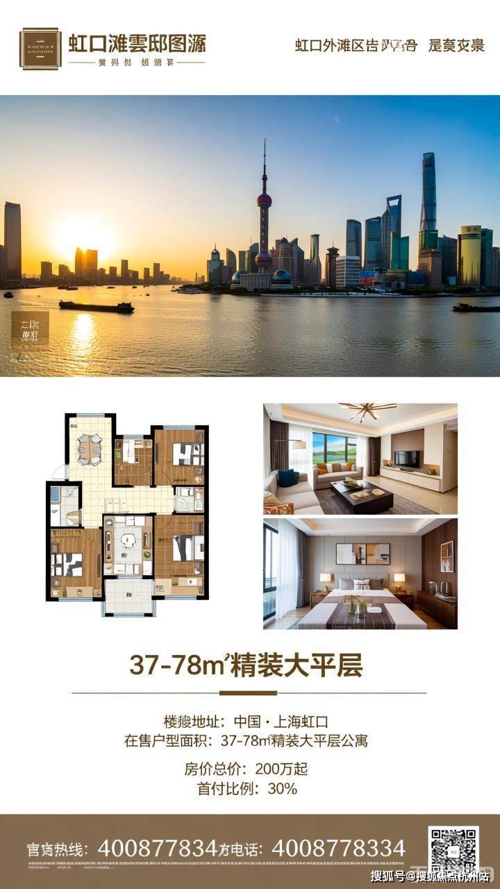 最新,外滩雲邸 虹口北外滩 建面约37~78㎡精装公寓!不限购!总价288万起!