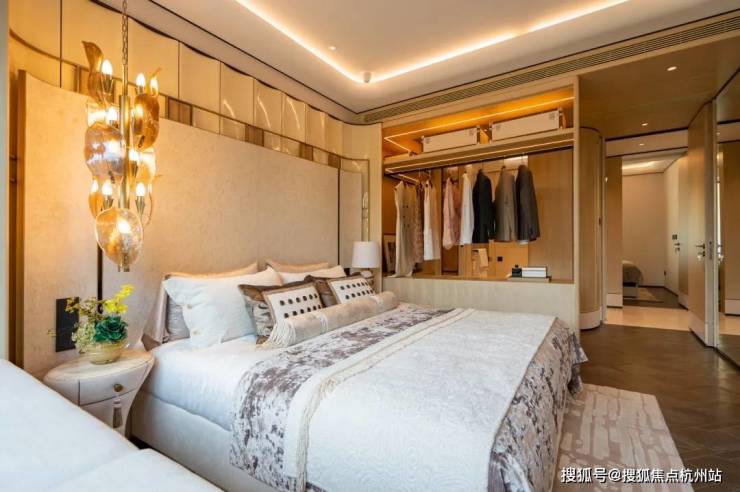 这可能是我见过弧形元素最多的样板间,吊顶、客厅墙面及卧室背景墙均采用大量曲面处理,涵盖木饰面与奢石等多种材质弧形工艺,即便工序复杂且成本高昂,但绿城仍坚持落实,只为业主更高级的使用体验