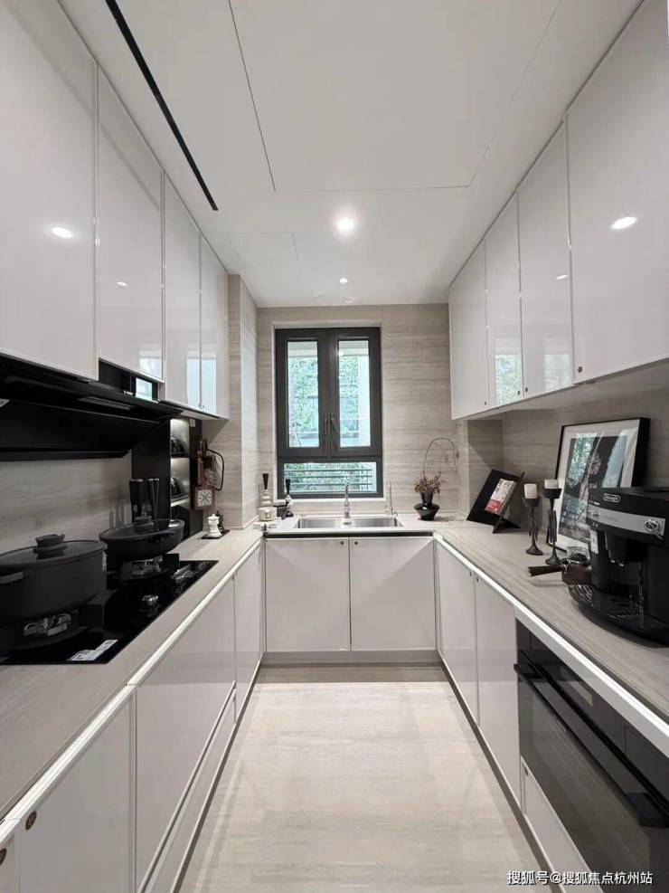 比如,厨房配了珍珠白吊柜、三组抽屉式拉篮合理搭配,调料架收纳、大容量踢脚抽、清洁用品收纳区,米面粮油、碗碟刀叉都可完美隐身。