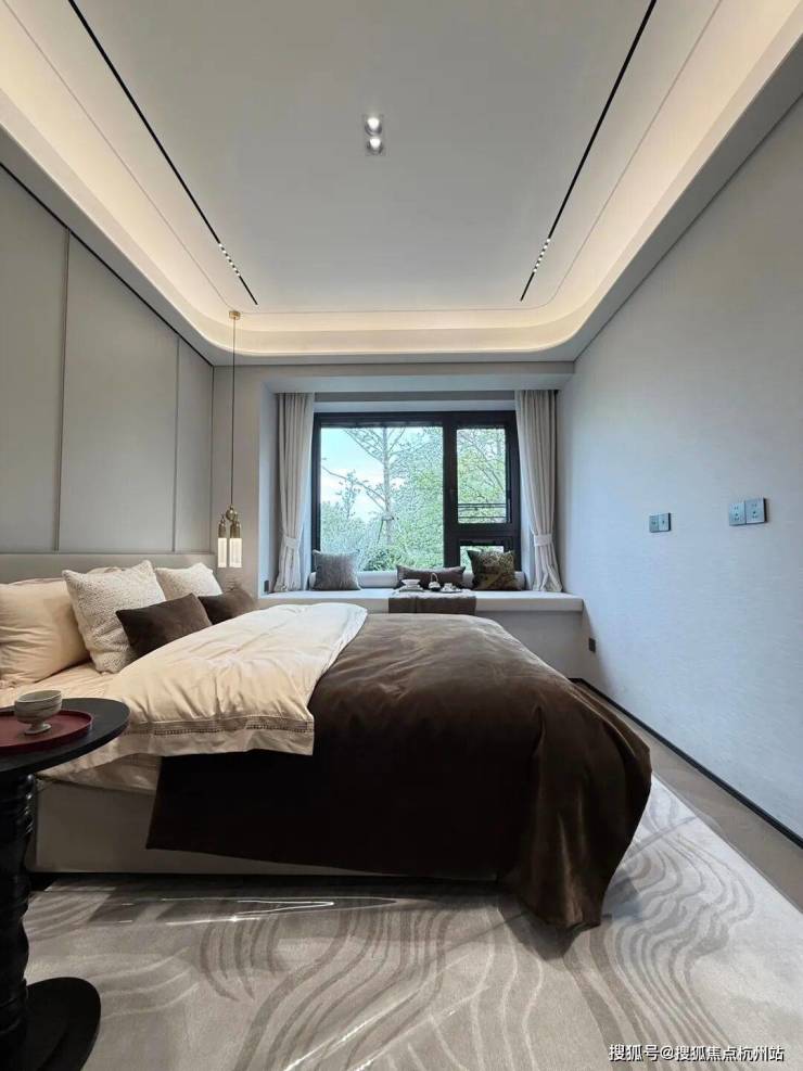 主卧转角落地窗+飘窗,也算是非常少见的了。净面宽约3.6m,不算进门的衣柜,进深大约5.7m左右。根据测算,可以放置宽约2m的床+2个床头柜(宽度约45cm/个)是可以的。