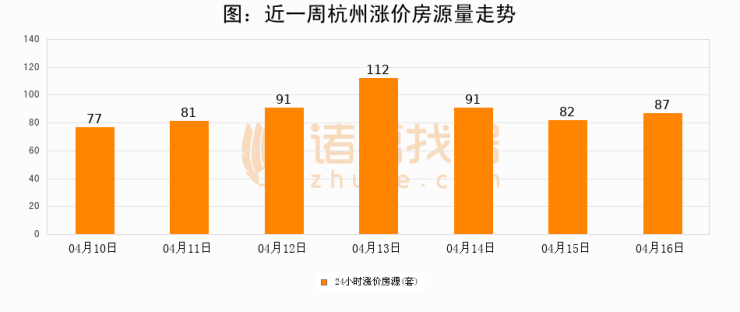 根据诸葛找房数据显示,杭州24小时涨价房源量为87套,较04月15日增加5套,环比上涨6.1%。与此同时,涨价房源占比小幅扩大,业主信心有所提升。