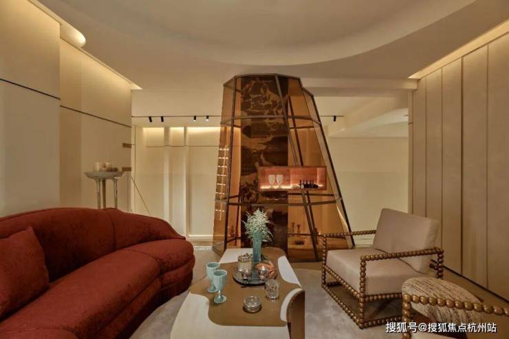 更加别具一格的设计在上方的负一层创意临展空间,透明的茶色玻璃壁炉贯穿于此,金属镶边与定制家具相应和,与华丽红沙发一道,应和着海派Art Deco风情,延展出融合历史与文化格调的能量回旋。